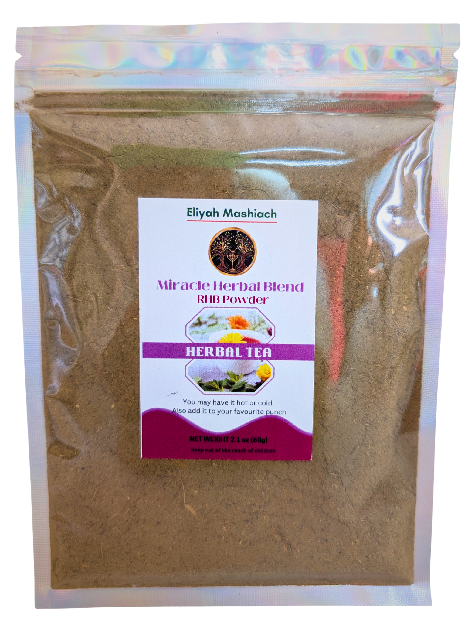 Mix ¼ to 1 teaspoon of the Eliyah Mashiach RHB-Powder Natural Blend with a cup of warm water, natural juice or smoothies once or twice daily.